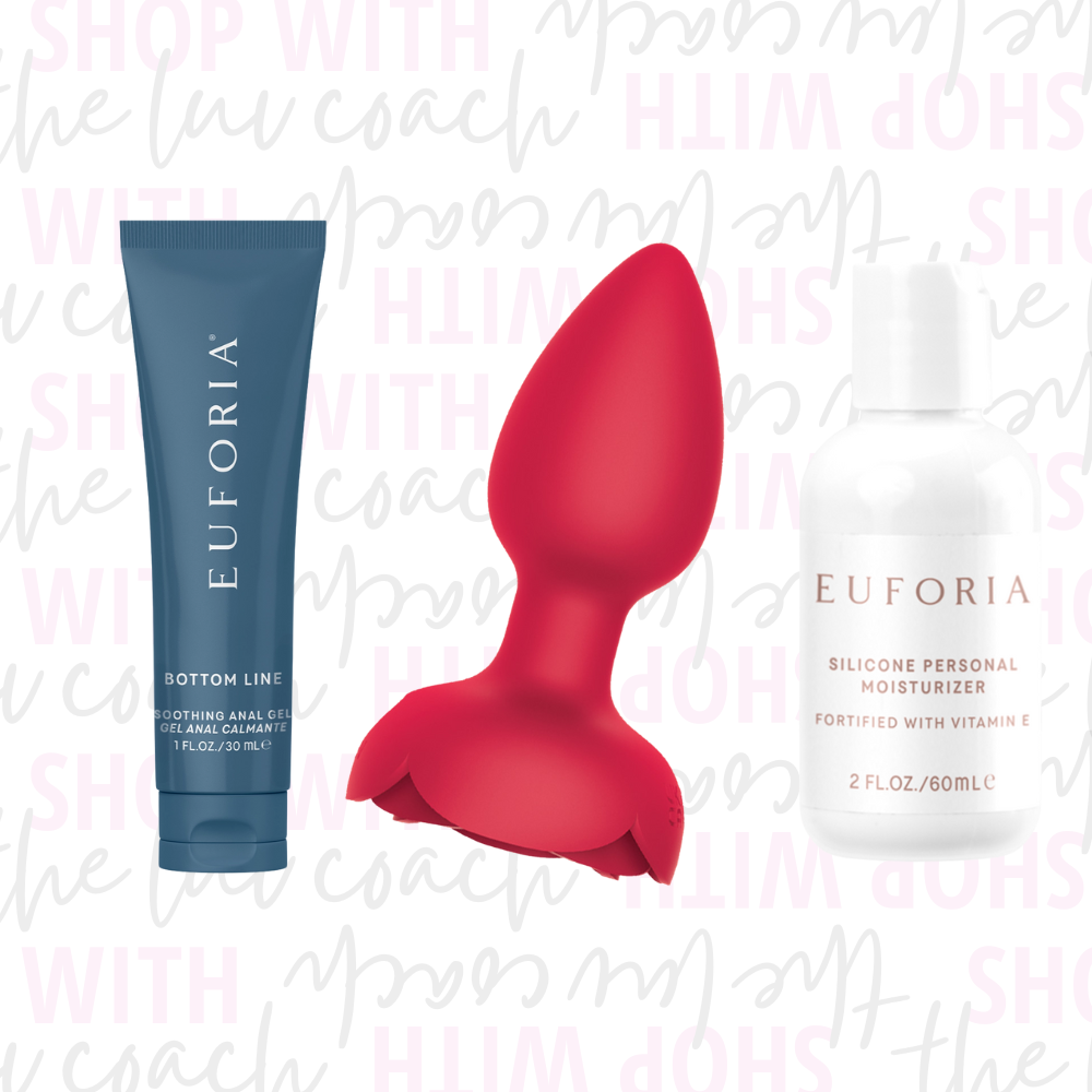 This is perfect for beginners as the Rosebud is not intimidating and has enough buzz to get your fun on. This comes with the Silicone with Vitamin E Lube and the Booty Ease called Bottom Line Comfort Gel.