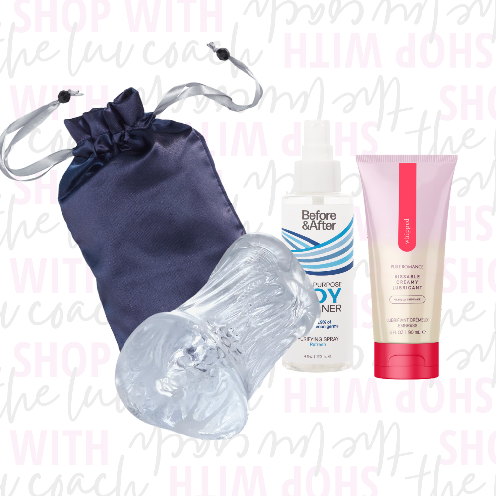 Fun set a man with the Triple Header (previously known as Trifecta) multi-chambered masturbator. The open-ended design, and flavored Whipped Creme Lubricant in Vanilla Cupcake make this set perfect for alone time.
